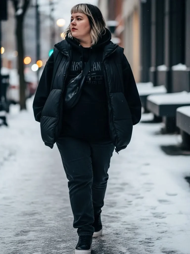 This look is built around a monochrome black palette that feels bold in the best way. The outfit pairs a chunky puffer vest with a cozy oversized hoodie that adds warmth and attitude at the same time. The black jogger style pants keep the whole vibe relaxed while still looking intentional. A crossbody bag sits neatly across the chest and adds that streetwear element. The black sneakers finish the outfit with a sporty touch. The whole look feels practical for icy sidewalks while still leaning full alt girl energy with the moody color scheme and layered textures.