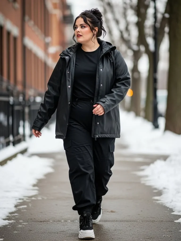 This outfit brings together a glossy black hooded jacket with a simple black tee and relaxed cargo style joggers for a look that feels both practical and seriously cool. The mix of matte and subtle shine in the fabrics adds that little extra edge without trying too hard. Chunky black and white sneakers finish the outfit with a sporty vibe that works perfectly for cold city streets. The whole look feels clean and modern with just enough attitude to stand out against the snowy backdrop.
