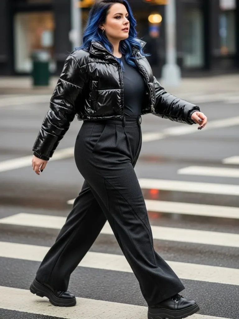 This outfit brings together a cropped black puffer with a glossy finish, a fitted dark top, and charcoal wide leg trousers that move beautifully with every step. The mix of textures feels bold and modern, especially with the soft shine of the jacket against the matte fabric of the pants. Chunky black platform shoes add height and a little attitude while still keeping everything practical for cold weather. The whole look feels city ready with an edgy confidence that works from morning errands to an evening stroll.