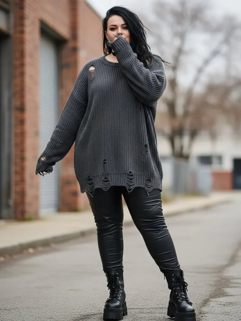This outfit brings together a charcoal oversized distressed sweater with a soft chunky knit that looks effortlessly cool and perfectly winter appropriate. The sweater has intentional rips and frayed edges that give it a grungy worn-in personality. It pairs so well with the black faux leather leggings that add structure and a little shine against the matte knit. The lace up platform combat boots keep the whole look grounded and edgy, creating that amazing balance of cozy and tough that alt winter fashion does so well.