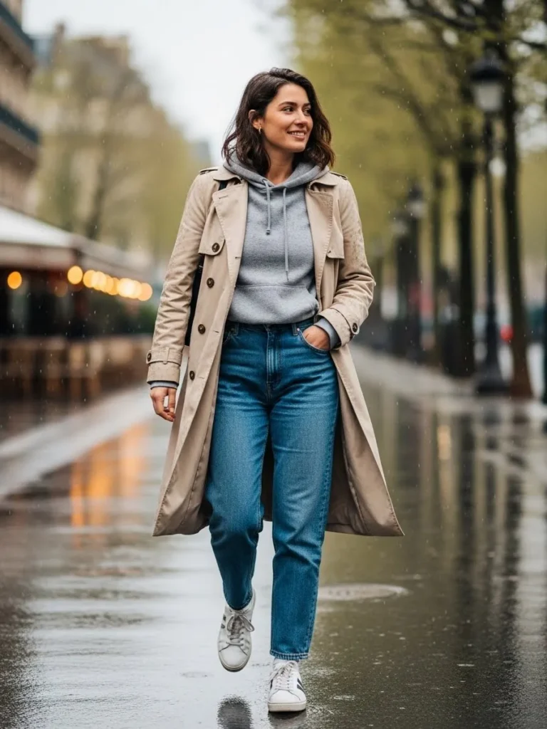 This outfit pairs a light beige trench coat with a soft gray hoodie, classic blue jeans, and clean white sneakers.