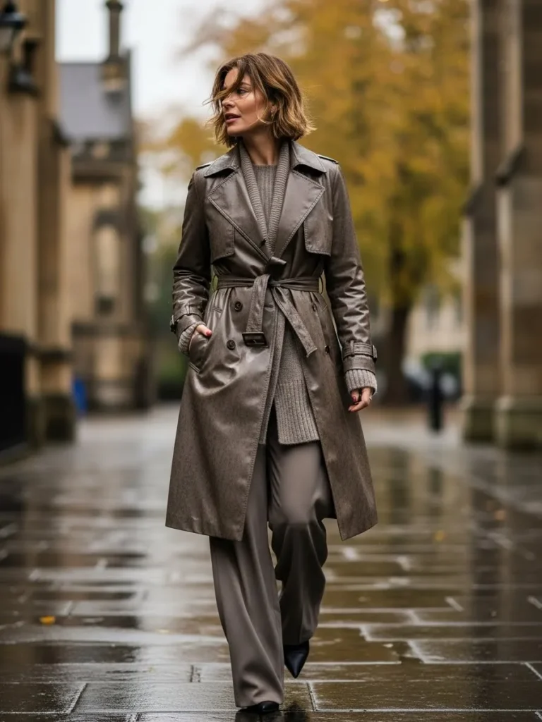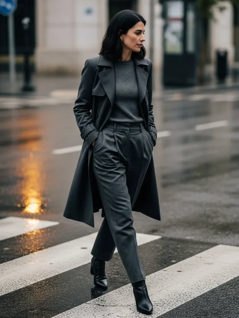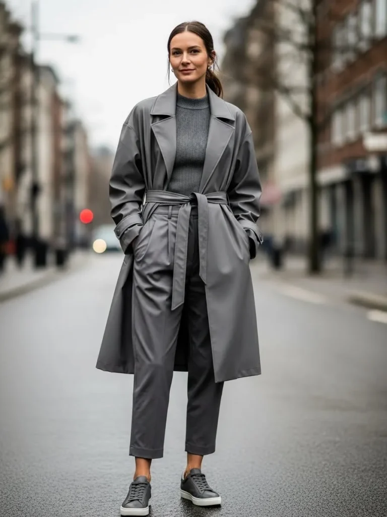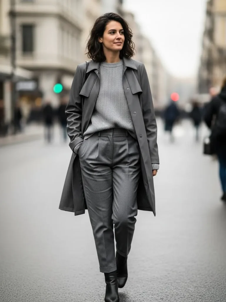 This outfit features a sleek gray trench layered over a matching knit top and tailored trousers. The fabrics look soft but structured, creating clean lines that feel very intentional. Neutral shoes keep the palette seamless while the overall fit stays relaxed and wearable for a rainy city walk.