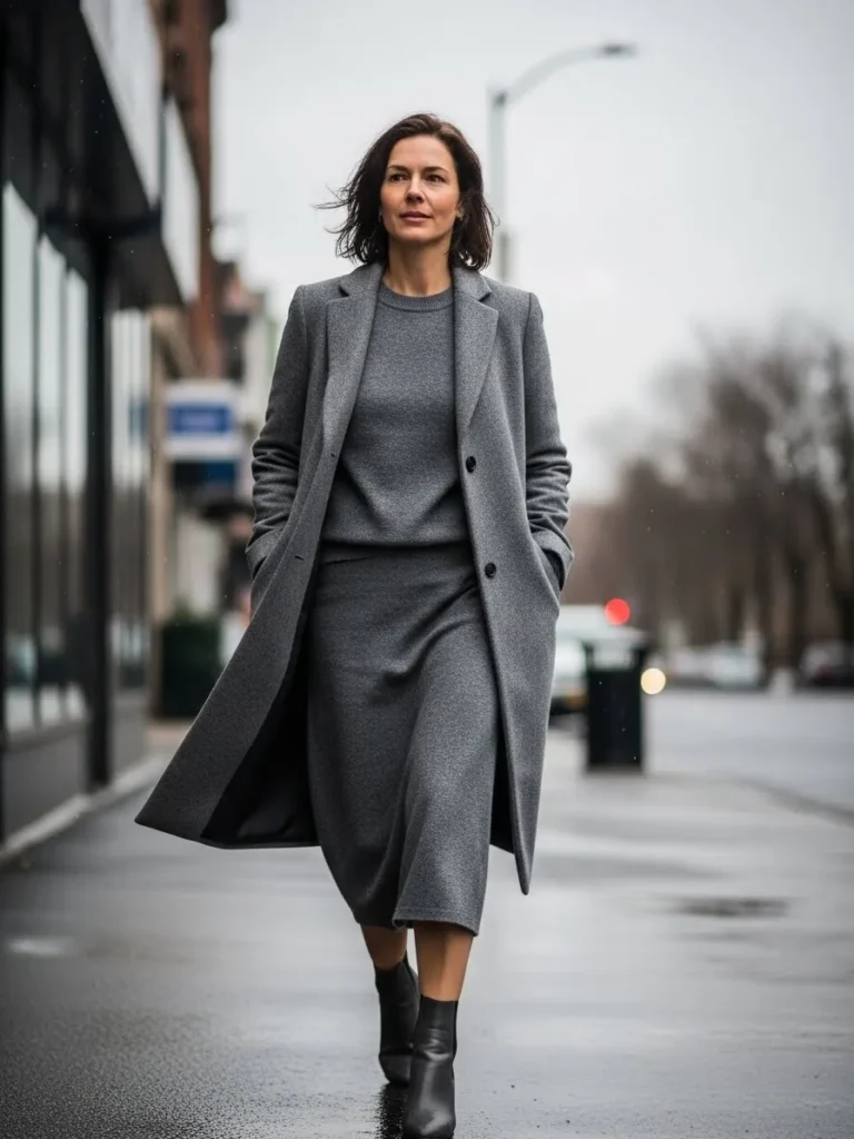 A simple gray midi dress is paired with a matching long coat for a clean and classic rainy day outfit. The fabrics look smooth and comfortable with just enough structure to hold their shape. Black ankle boots add contrast without breaking the monochrome feel.