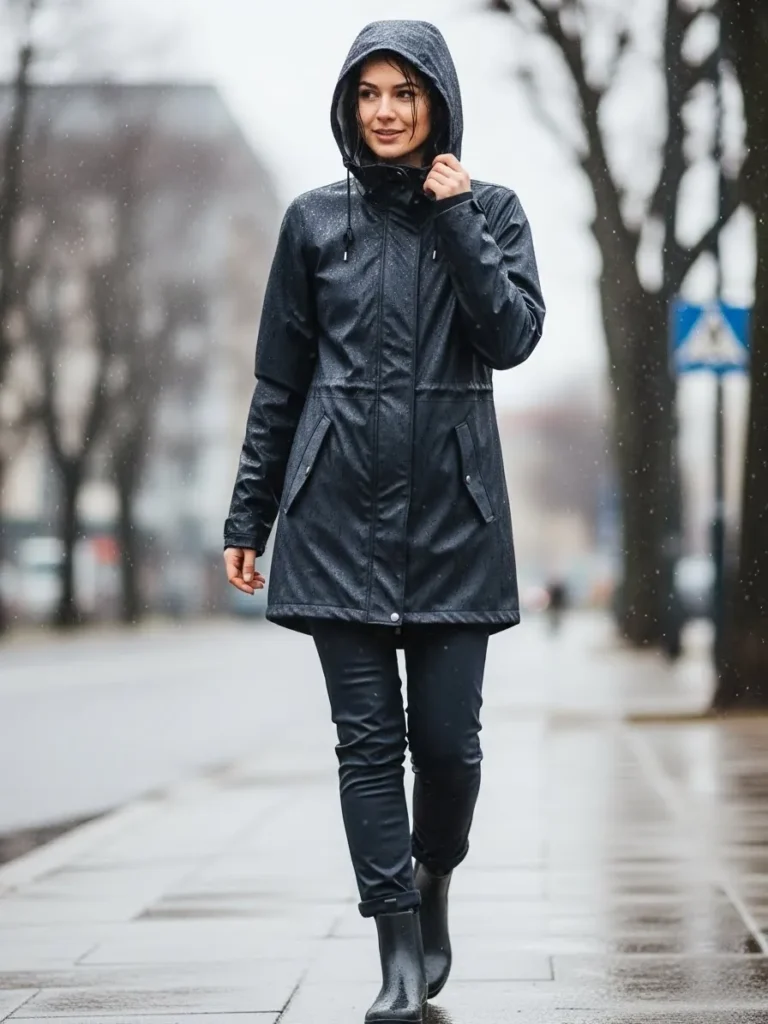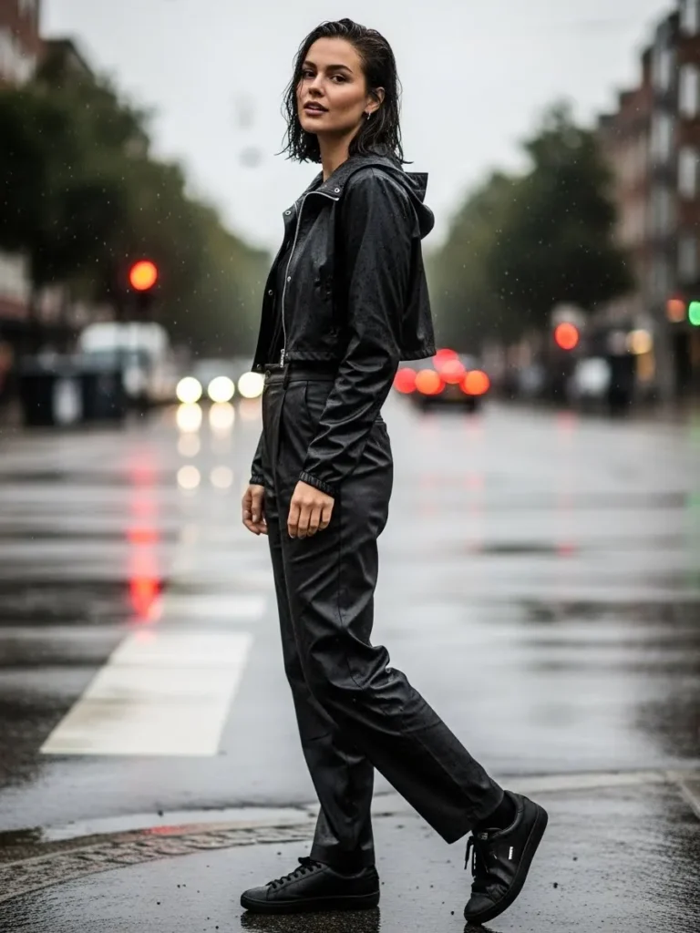 This look centers around a fitted black rain jacket paired with matching slim trousers and tall boots. The fabric has a slight sheen that feels practical and modern. The hood adds function while keeping the overall silhouette streamlined.