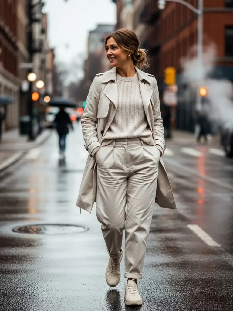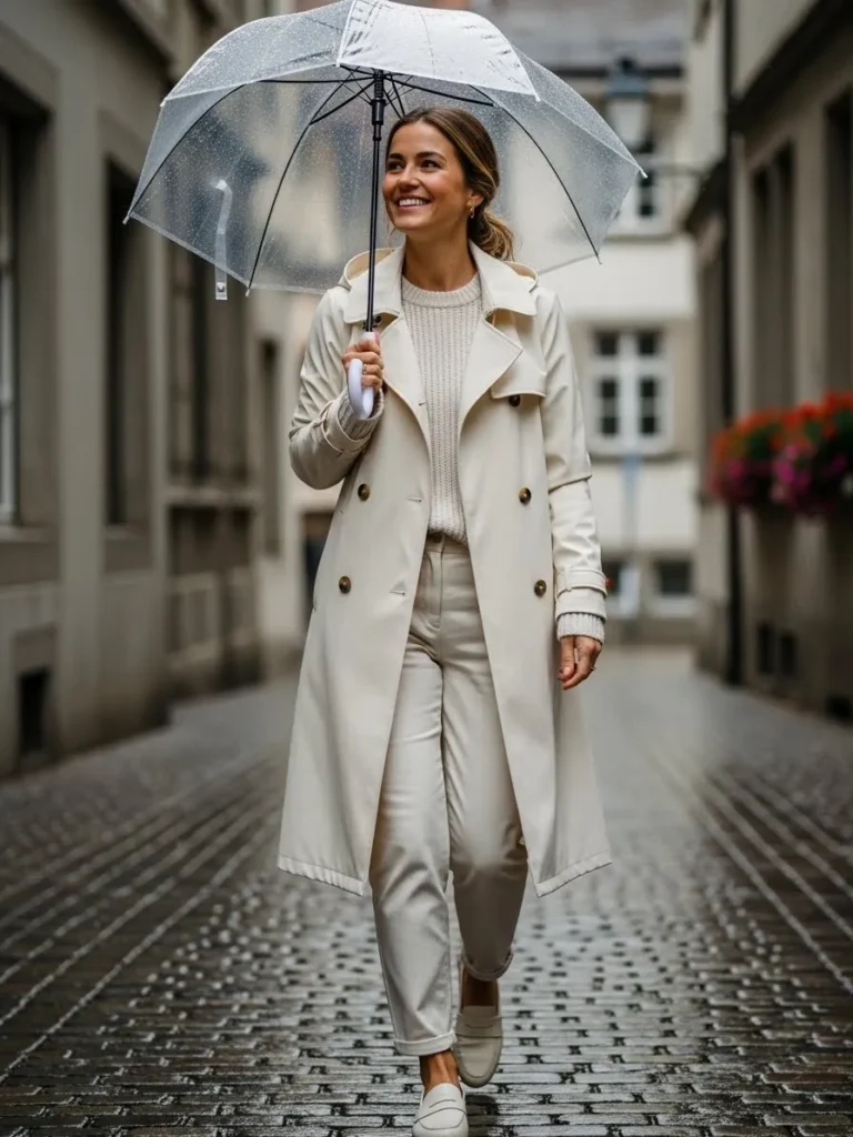 A light cream trench coat is styled with matching trousers and a soft top underneath. The lighter color stands out beautifully against wet streets while still feeling minimal. Neutral shoes and a clear umbrella keep the look practical and polished.