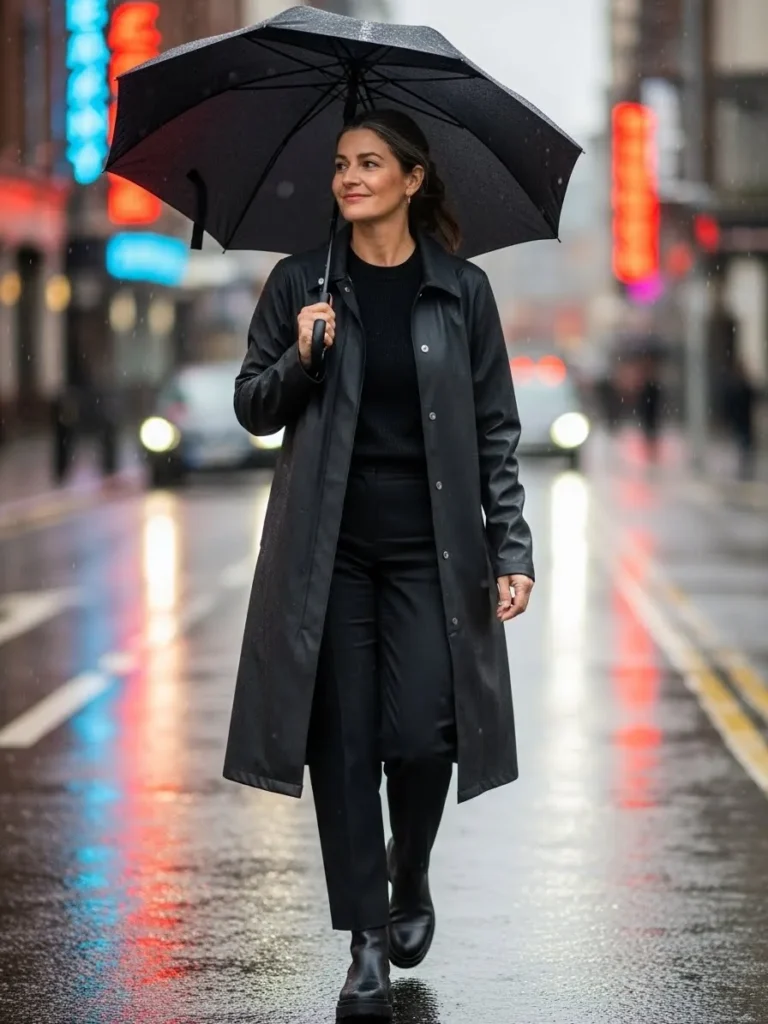 This outfit leans into sleek black tailoring with a long structured coat layered over a fitted top and tapered trousers. The fabric looks smooth and slightly matte which works perfectly against the wet pavement. Simple black ankle boots keep the look grounded and very city ready.