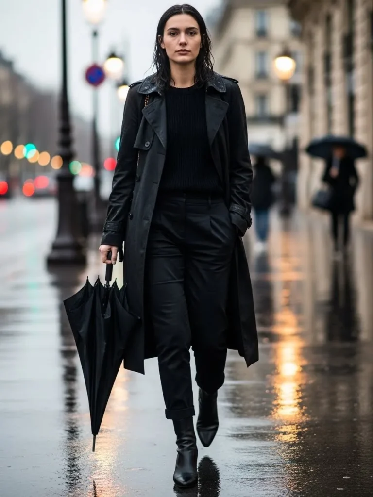 A long black coat is layered over a black top and trousers creating a sharp monochrome silhouette. The wet pavement adds shine that complements the dark tones beautifully. A black umbrella ties everything together in a very classic way.