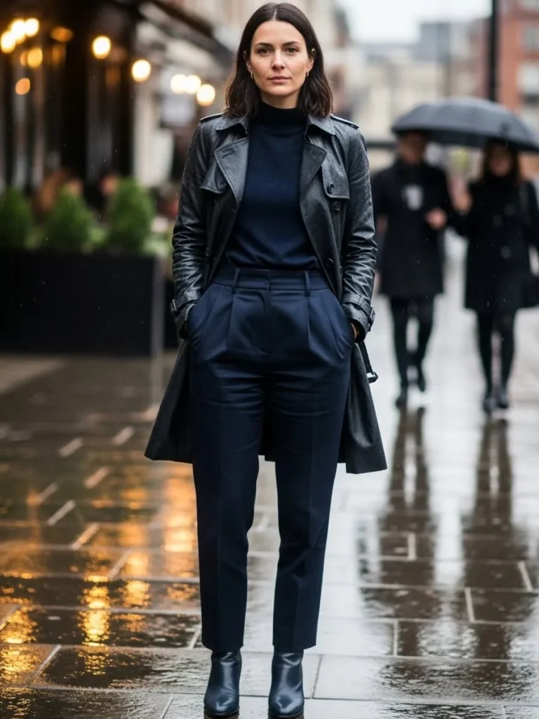 This look features deep navy from head to toe with a structured coat layered over a fitted top and tailored trousers. The ankle boots add a sharp finish and the overall fit feels clean and streamlined. The rain soaked street reflects the dark tones beautifully which adds to the mood.