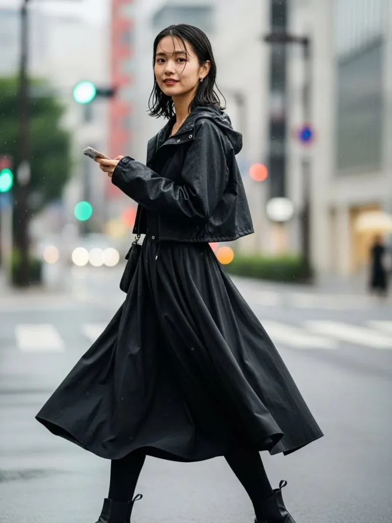 A black long sleeve dress with a fluid skirt creates movement and elegance while staying practical for rain. The fabric looks lightweight but structured enough to hold its shape. Simple black boots keep the outfit grounded and ready for walking through the city.