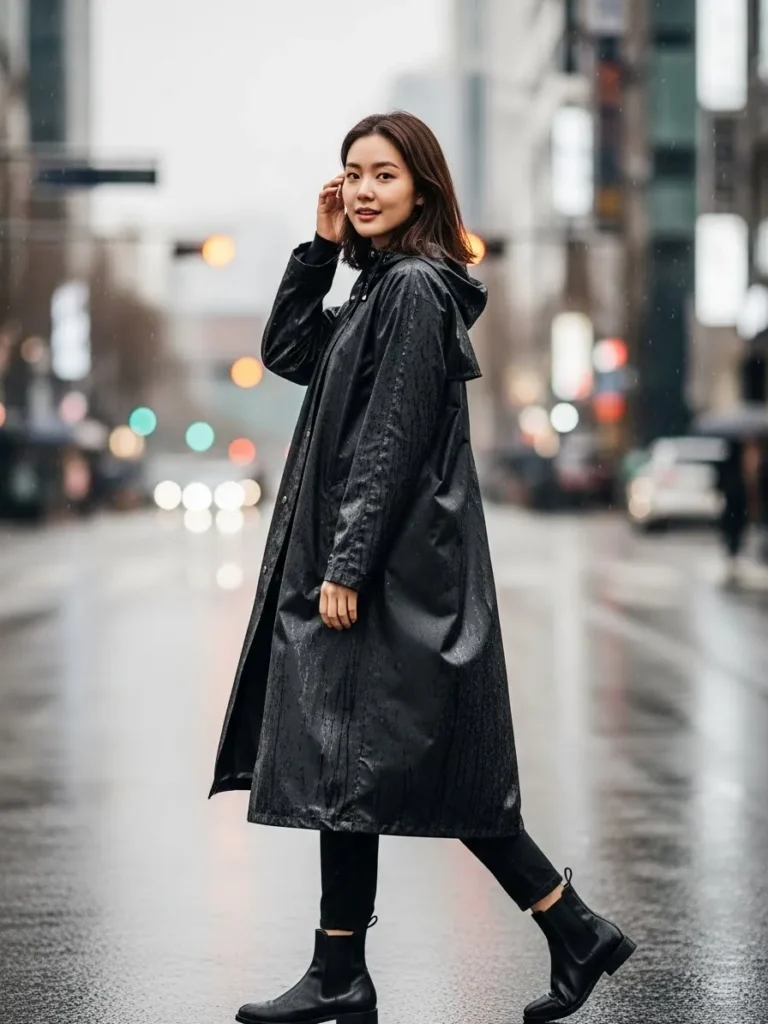 A long black coat with subtle texture is layered over a simple black outfit for a clean rainy day look. The straight fit and ankle boots make it practical while still feeling stylish. The overall vibe is minimal with just enough edge.
