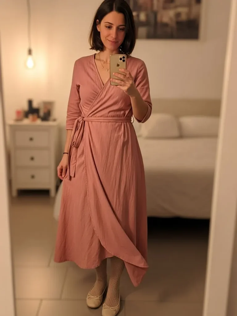 This outfit centers around a dusty rose wrap dress with a flattering V neckline and a tie waist that gently defines the shape.