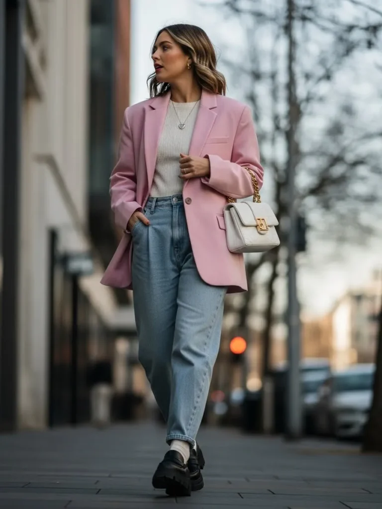 This look pairs a structured pink blazer with a simple knit top and relaxed fit jeans.