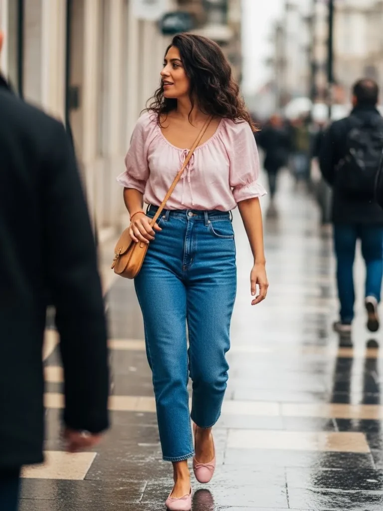 This look features a light pink blouse with soft sleeves paired with classic blue jeans.
