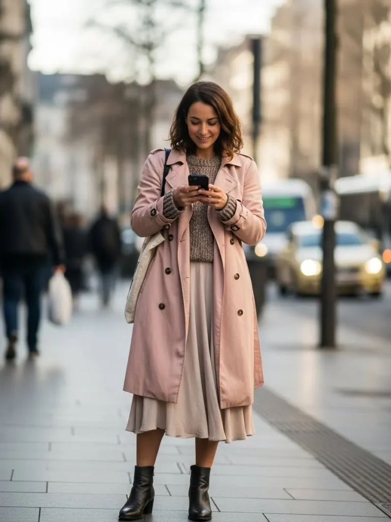 This outfit centers around a blush trench coat layered over a neutral knit and flowy skirt.