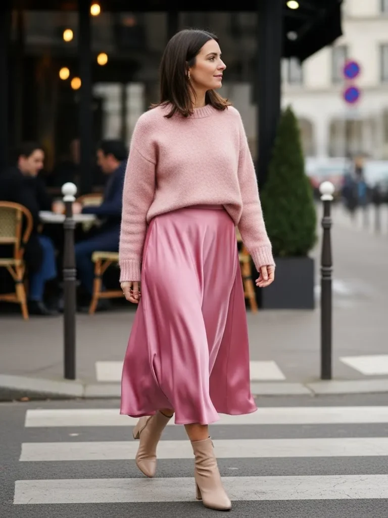 This outfit pairs a soft blush knit sweater with a silky pink satin midi skirt that moves beautifully while walking.