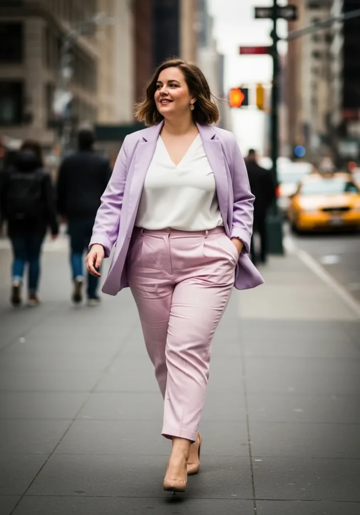 A pastel lavender blazer layered over a white top pairs beautifully with soft pink tailored trousers. The structured blazer adds a stylish edge while the gentle pastel colors keep the look feminine and spring ready. Nude heels complete the outfit with a polished feel.