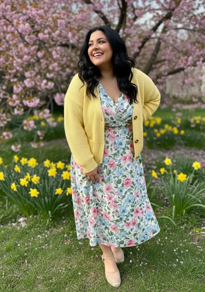 A delicate floral midi dress filled with soft spring colors pairs perfectly with a light yellow cardigan. The flowy dress moves gracefully while the cardigan adds a cozy layer that feels perfect for mild spring weather. Simple sandals keep the outfit relaxed and feminine.