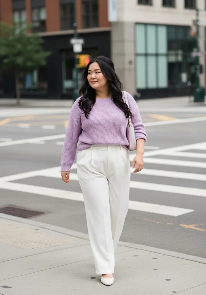 A soft lavender sweater tucked into cream wide leg trousers creates a refined and comfortable pastel outfit. The gentle knit texture adds warmth while the tailored trousers keep the look clean and elegant. Neutral shoes tie everything together effortlessly.