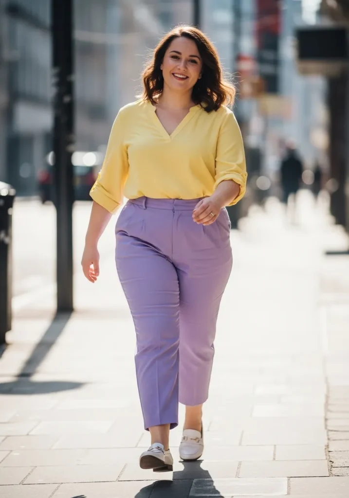 A soft sunny yellow blouse paired with tailored lavender ankle trousers creates a cheerful pastel combination that feels made for spring. The blouse has a relaxed flow that balances beautifully with the structured fit of the trousers. White sneakers keep the outfit casual and modern while the pastel color pairing feels light and fresh.