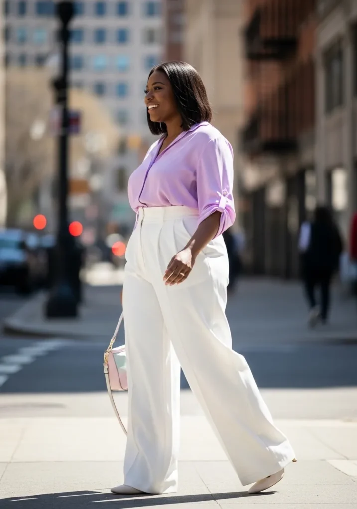 A relaxed lavender wrap blouse paired with crisp white wide leg trousers creates a modern and refreshing pastel outfit. The wrap detail softly shapes the waist while the flowy trousers keep the look airy and comfortable. A small pastel handbag adds a charming finishing touch.