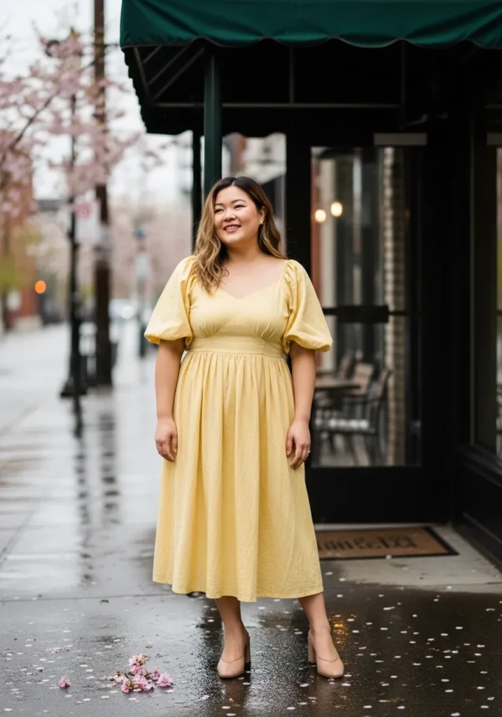 A butter yellow midi dress with puff sleeves brings a playful and cheerful vibe to a spring outfit. The soft fabric flows gently while the puff sleeves add a touch of personality and charm. Simple sandals keep the look relaxed and comfortable for a warm spring afternoon.