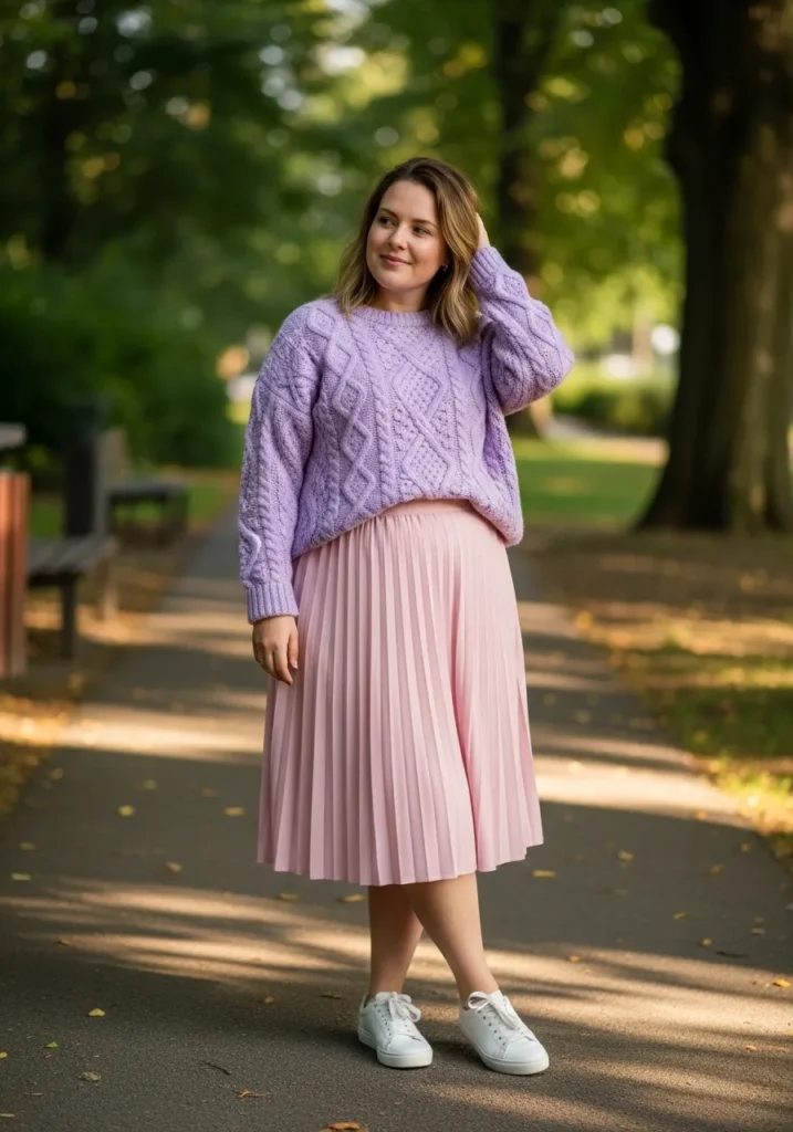 A cozy lavender knit sweater paired with a soft pink pleated midi skirt creates a beautiful pastel pairing. The chunky texture of the sweater contrasts nicely with the smooth flow of the pleated skirt. White sneakers keep the look relaxed and easygoing.
