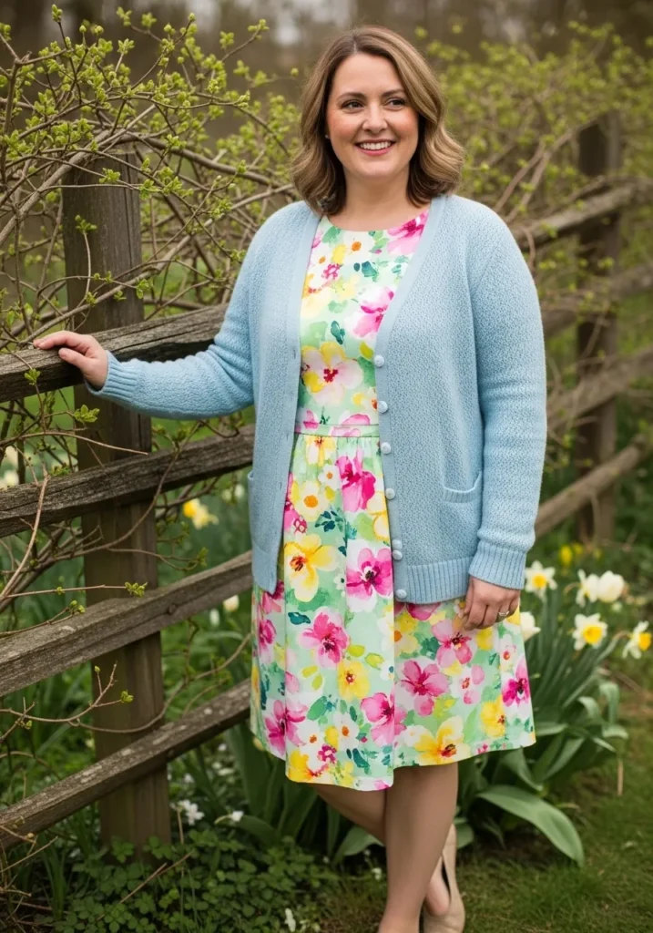 A colorful floral dress filled with pink and yellow blossoms pairs perfectly with a soft pastel blue cardigan. The cardigan adds a gentle layer while the floral pattern celebrates the beauty of spring. Simple flats complete the outfit with a comfortable and casual touch.