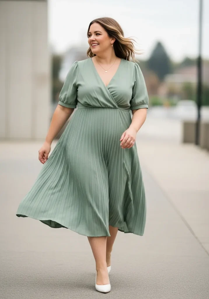 A soft mint green wrap dress creates a beautiful flowing silhouette that flatters curves in the best way. The V neckline and gentle waist tie shape the outfit nicely while the lightweight fabric drapes smoothly as she walks. White heels finish the look with a clean and fresh touch that keeps everything light and spring ready.