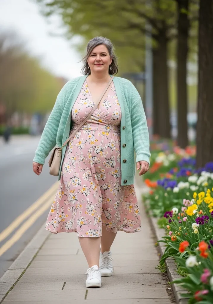 This look feels like a little celebration of spring. I love how the floral pattern and pastel cardigan create such a cheerful combination. It is the kind of outfit that makes a simple walk through the park feel extra special.
