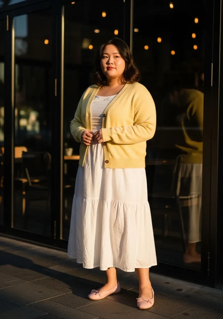 A soft butter yellow cardigan layered over a light cream dress creates a warm and inviting spring outfit. The cardigan adds a cozy touch while the neutral dress keeps the look clean and effortless. Simple flats make the outfit comfortable enough for a relaxed day out.