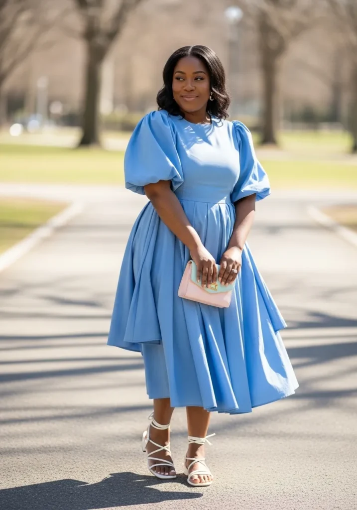 A beautiful sky blue midi dress with puff sleeves creates a graceful and eye catching spring outfit. The structured sleeves add a bit of drama while the flowing skirt keeps the look soft and elegant. White heels and a small pastel bag finish the outfit with a polished touch.