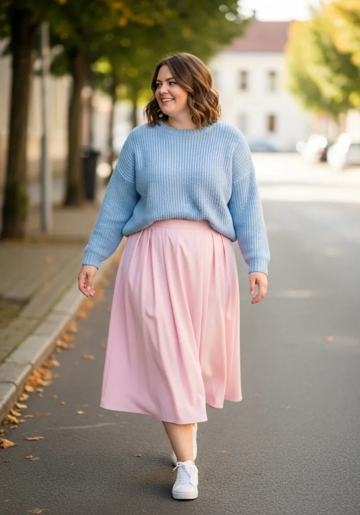A soft textured blue sweater tucked into a pastel pink midi skirt creates a balanced and stylish look. The knit sweater feels cozy while the flowing skirt adds movement and elegance. White sneakers give the outfit a relaxed everyday vibe that still feels chic.