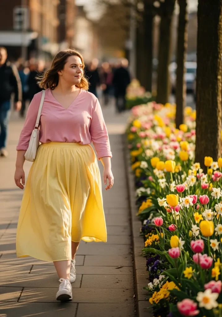 A blush pink sweater paired with a bright pastel yellow midi skirt creates a cheerful and playful spring outfit. The soft knit top keeps the look cozy while the flowing skirt adds a lively pop of color. Neutral shoes keep the focus on the beautiful pastel palette.