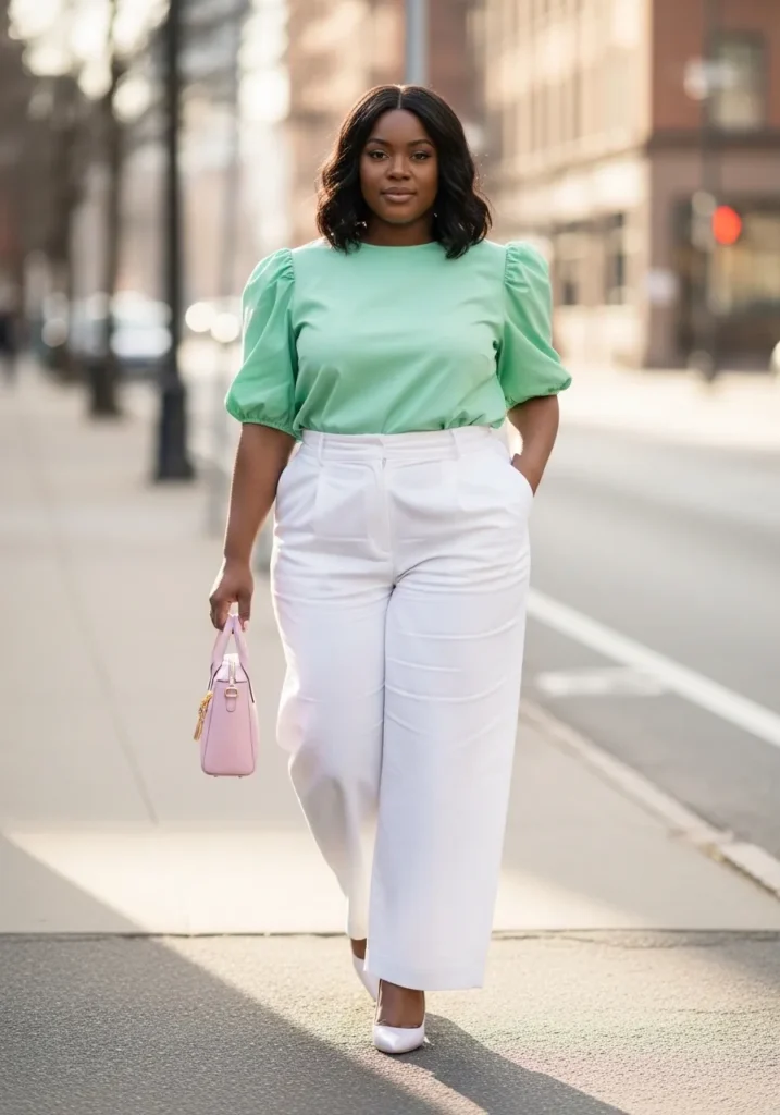 A fresh mint green blouse styled with crisp white wide leg trousers creates a clean and modern spring outfit. The relaxed blouse keeps the look breezy while the tailored trousers add structure and polish. A small pastel handbag adds a sweet finishing touch.