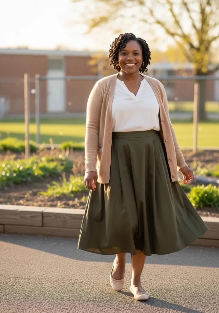 This outfit pairs a light cream cardigan with a simple white top and a flowing olive green midi skirt that moves beautifully with every step. The skirt has a soft drape that gives it an easy spring feel while still looking polished enough for the classroom. Nude or beige flats keep the look grounded and comfortable, while the neutral tones make the whole outfit feel calm and effortlessly put together.