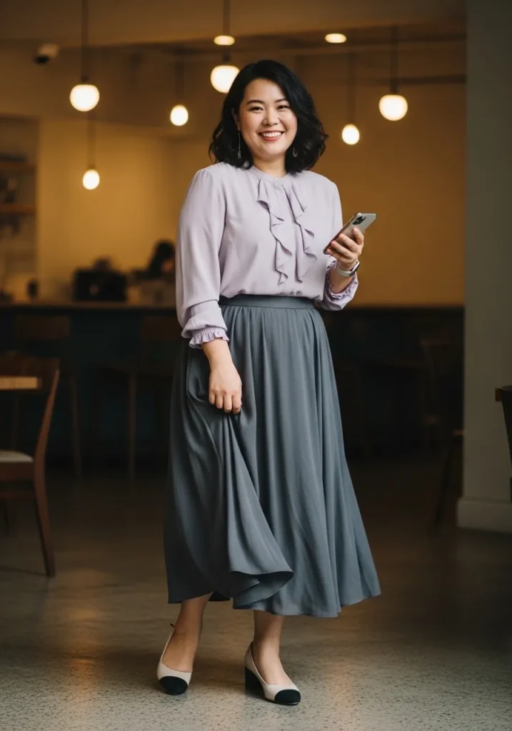 This outfit pairs a soft pastel blouse with a flowing gray midi skirt that moves beautifully with every step. The skirt has a gentle drape that adds elegance without feeling too formal. Simple heels or flats complete the look while keeping the outfit comfortable for everyday wear.
