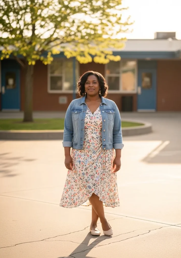 This outfit features a soft floral dress that falls just below the knees and brings a cheerful spring vibe to the classroom. A light denim jacket layered on top adds a casual and practical touch while neutral flats keep the look comfortable and grounded.