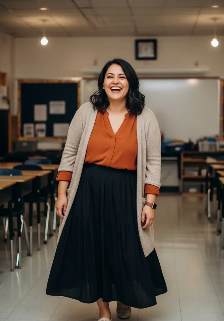 This outfit pairs a warm rust colored blouse with a flowing black pleated midi skirt that moves beautifully with every step. A soft neutral cardigan adds a cozy layer that makes the look feel relaxed yet polished for the classroom. The skirt has gentle pleats that create elegant movement while simple flats keep the outfit comfortable and practical for a full day at school.