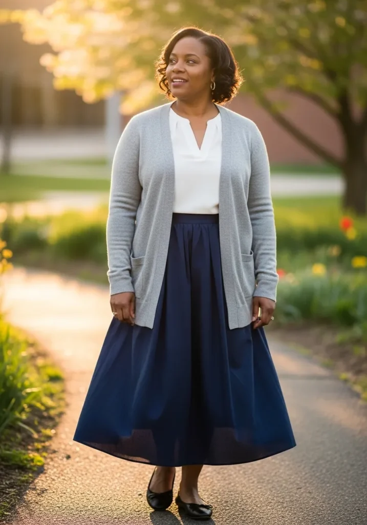 This outfit combines a crisp white blouse with a soft gray cardigan and a deep navy midi skirt that flows gracefully as you walk. The skirt has a light airy drape that adds movement and elegance while still feeling very classroom appropriate. Neutral flats keep the outfit grounded and comfortable.