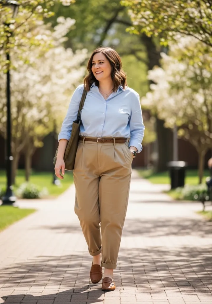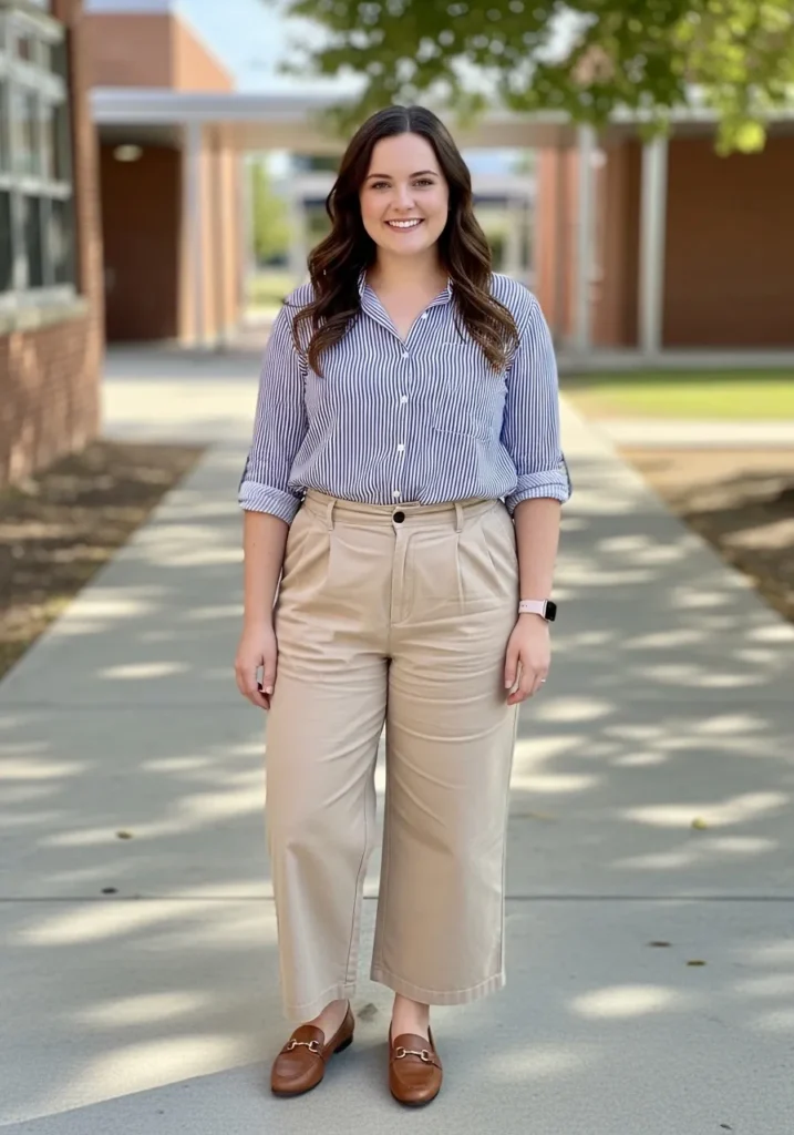 This outfit features a blue striped button up shirt tucked neatly into relaxed khaki trousers that hit just above the ankle. The stripes bring a classic touch while the neutral pants keep the outfit grounded and versatile. Brown loafers add a warm and comfortable finish that works perfectly for long teaching days.
