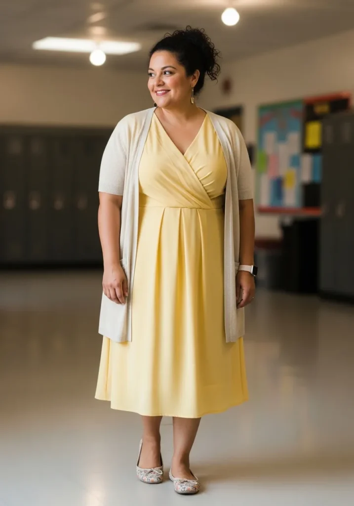 This outfit centers around a cheerful yellow wrap dress that creates a flattering shape while still feeling light and breezy. A soft neutral cardigan adds an extra layer that keeps the outfit classroom friendly and comfortable. Simple flats complete the look and keep it practical for long school days.