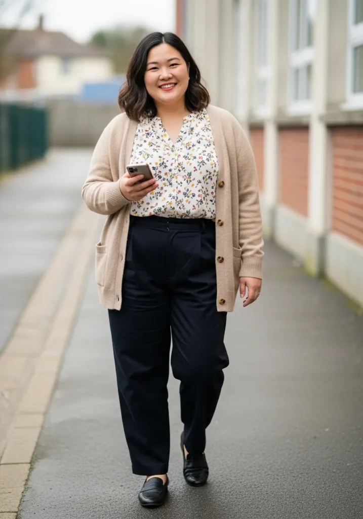 I always think a printed blouse is a great way to add life to a work outfit without going over the top. The navy trousers keep the look balanced while the cardigan adds that extra comfort factor that teachers truly appreciate. It feels stylish but still practical for a full day at school.