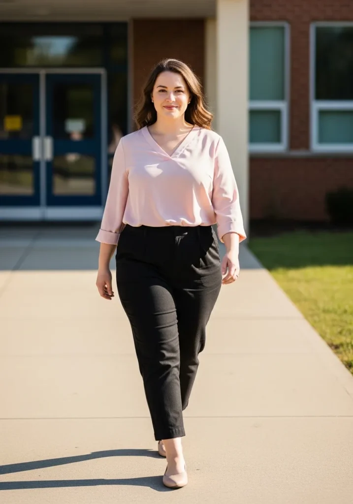 I love how this combination instantly looks put together. The blush tone adds a fresh spring touch while the black trousers keep everything grounded and work appropriate. When I wear something like this I feel ready for both teaching and any surprise meetings that pop up during the day.
