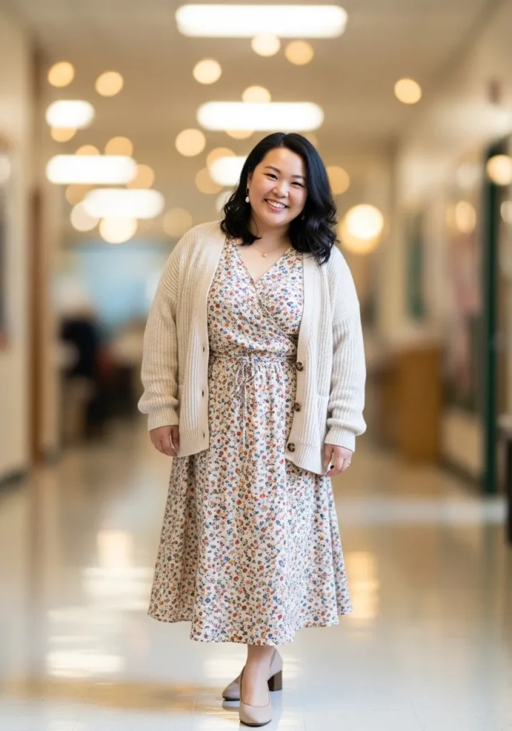 I always feel like floral dresses are perfect for spring teaching days. They add a cheerful vibe while still looking elegant and appropriate for work. Adding a cardigan keeps the look cozy and balanced which makes it ideal for a busy school schedule.