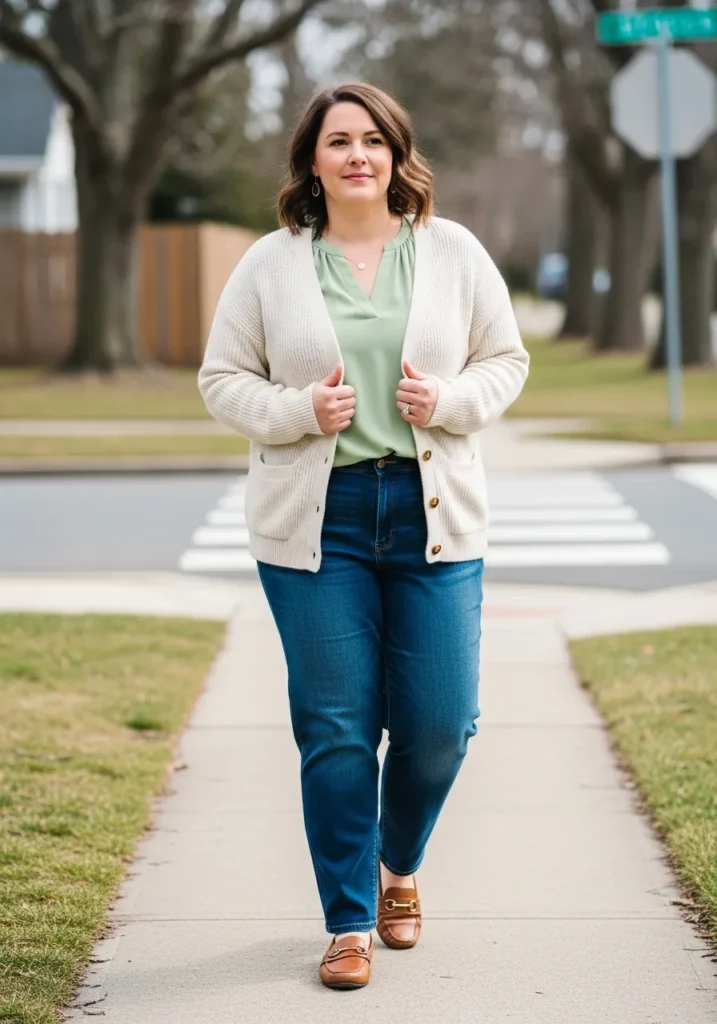 This outfit features a soft cream cardigan layered over a light top and paired with dark wash jeans that have a flattering straight fit. The jeans give the outfit a relaxed everyday feel while still looking neat and classroom appropriate. Brown loafers add warmth and a polished touch that pulls the whole look together.