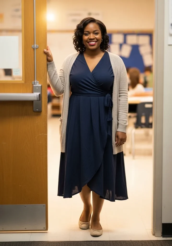 This outfit centers around a navy wrap style dress that creates a flattering shape while still feeling comfortable and easy to wear. A light neutral cardigan layered over the dress softens the look and adds a practical layer for cooler classrooms. Simple pumps or flats complete the outfit with a clean and polished finish.