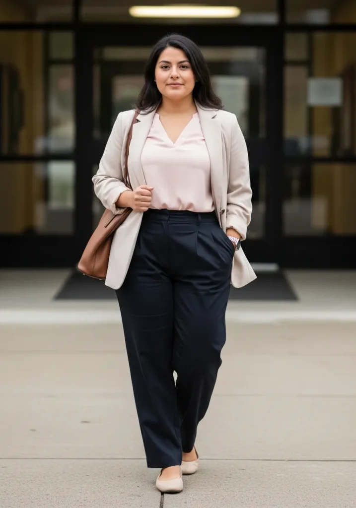 This outfit features a soft blush blouse tucked into tailored black trousers that have a relaxed but structured fit. A light beige blazer adds a polished layer that makes the whole look feel professional and confident. Neutral flats or low heels keep the outfit comfortable while maintaining a sharp silhouette.