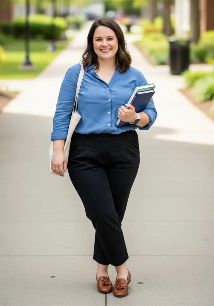 This outfit features a crisp blue button up blouse paired with sleek black trousers that create a clean and modern silhouette. The top has a relaxed drape that keeps the outfit from feeling too stiff while brown loafers add warmth and personality to the look. Carrying a notebook or planner adds a subtle teacher vibe to the whole scene.