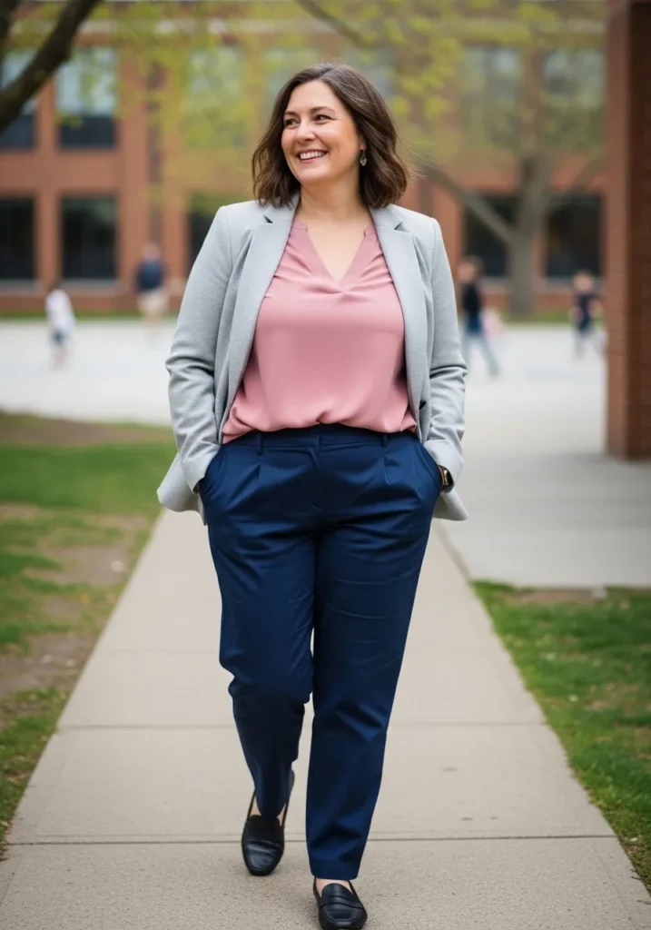 This outfit combines a soft pink blouse with tailored navy trousers and a light gray blazer layered on top. The mix of soft and structured pieces creates a balanced look that feels both approachable and professional. Dark loafers or flats add a neat finishing detail that keeps the outfit classroom friendly.