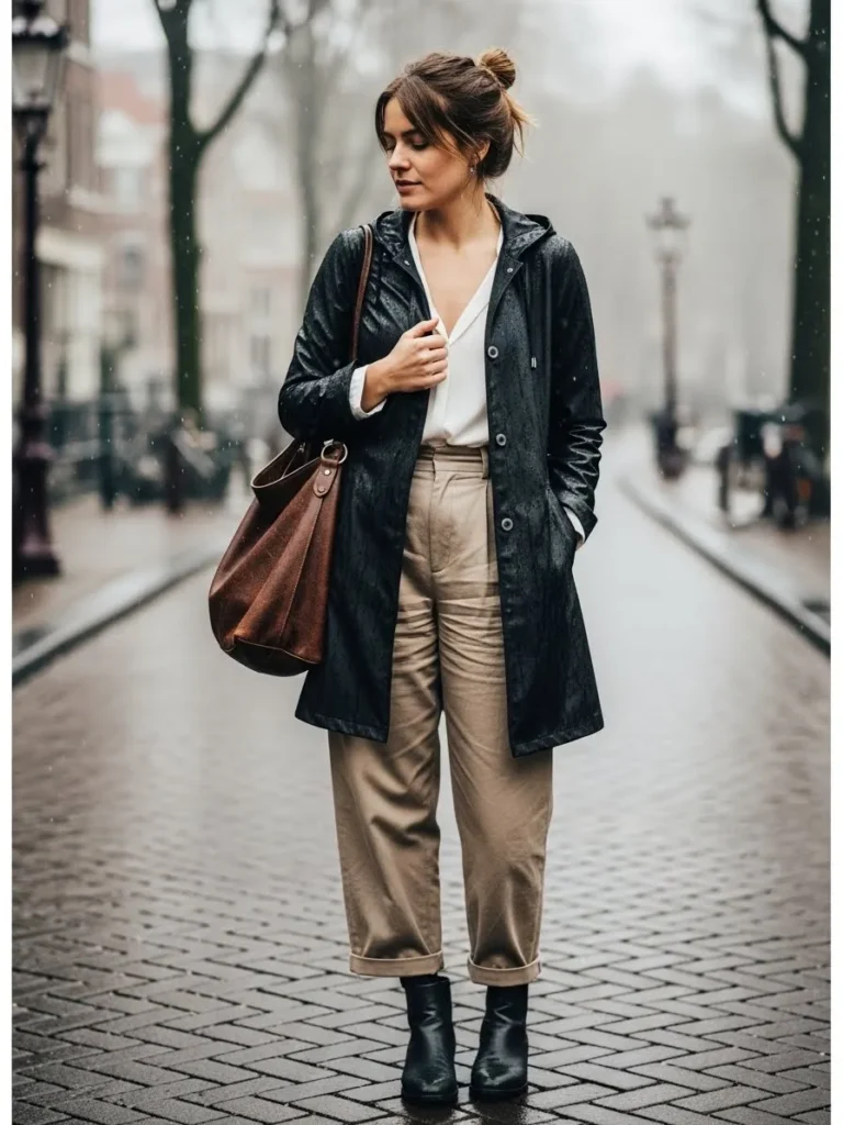A dark rain friendly jacket is layered over a light top and relaxed neutral trousers. Black ankle boots add structure, while a roomy brown bag brings warmth and texture. The mix of tailored and casual pieces feels modern and wearable.